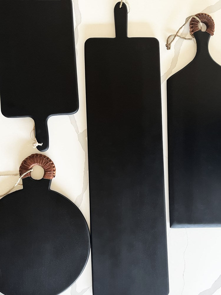 Elevate your entertaining with our Artisan Platter Serving Board in Black. Hand-finished and delightfully sized at 52x25x1cm, this beautiful board is perfect for serving cheeses, antipasto, desserts, or creating a stunning grazing platter. Crafted from high-quality sustainably sourced mango wood with a sleek black finish, this serving board brings rustic charm and modern sophistication to your table. Whether you're hosting a dinner party or enjoying a quiet night in, its a stylish essential for any home entertainer. Features: Premium black finish for a rich, natural look Generous 52x25x1cm size ideal for grazing platters or shared dishes Smooth rounded edges and artisan craftsmanship Perfect for entertaining, gifting, or everyday use Easy to clean and care for, just wipe clean A must-have for hosts who love to impress.