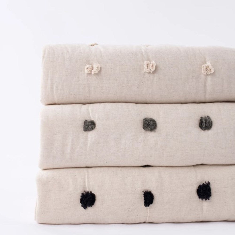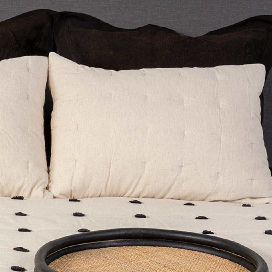 The must have statement quilt. Cotton/linen mix, features pompoms in contrasting black. 260 x 240cm. 85% cotton and 15% linen, with 200gsm polyester filling. Gentle, cold machine wash separately. Do not bleach or dry clean. Tumble dry on low heat. Please note Pillowshams sold separately.