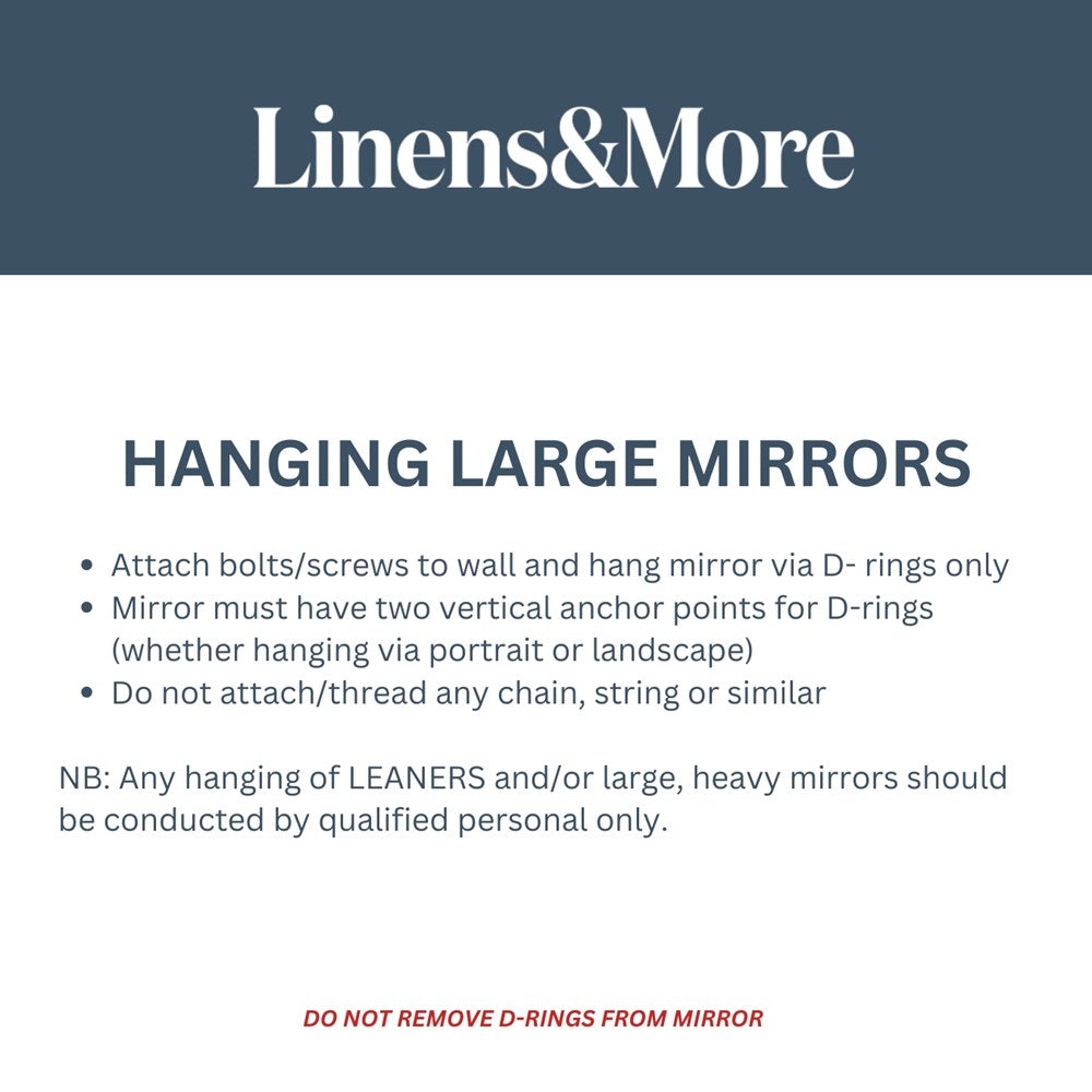 Metal framed mirror matt black. Measures H180cm x W90cm. Not recommended for wet areas. Weight 26kg