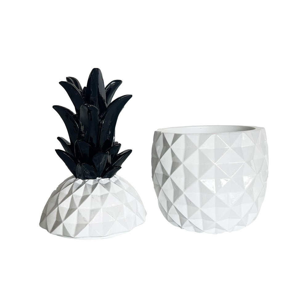 Our Contemporary Pineapple decorative storage box in White & Black is the perfect storage solution for your jewellery, keepsakes, or small everyday essentials. With a crisp black and white palette and playful detailing, this box blends beautifully into modern vanities, bedside tables, or gift boxes. Crafted with a sleek gloss finish and clean lines, its ideal for anyone who loves understated style with a contemporary twist. Whether you're storing rings, earrings, or meaningful mementos, this stylish trinket box keeps everything safe - and looking good doing it. Measures 10.5x10.5x22cm
