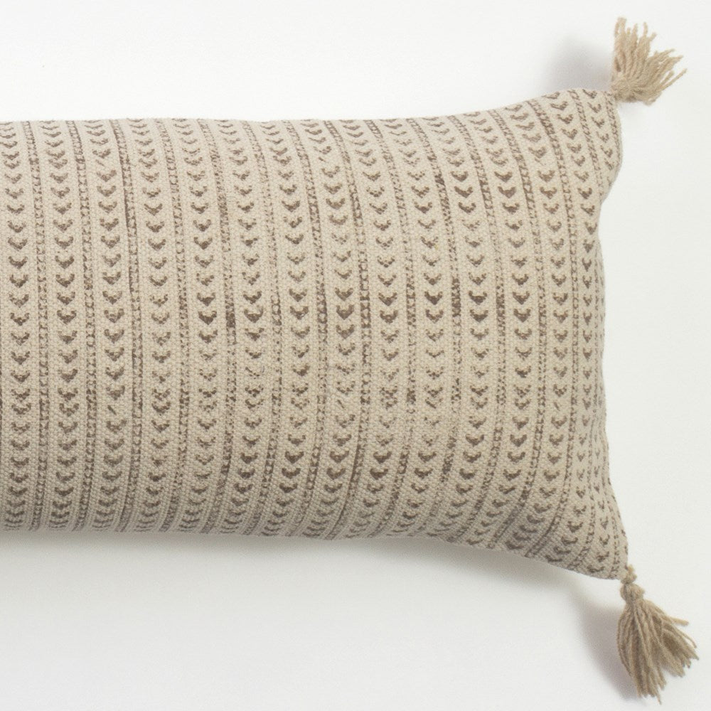 Natural coloured, patterned feature cushion with tassels with cotton inner. Size 36 X 107cm