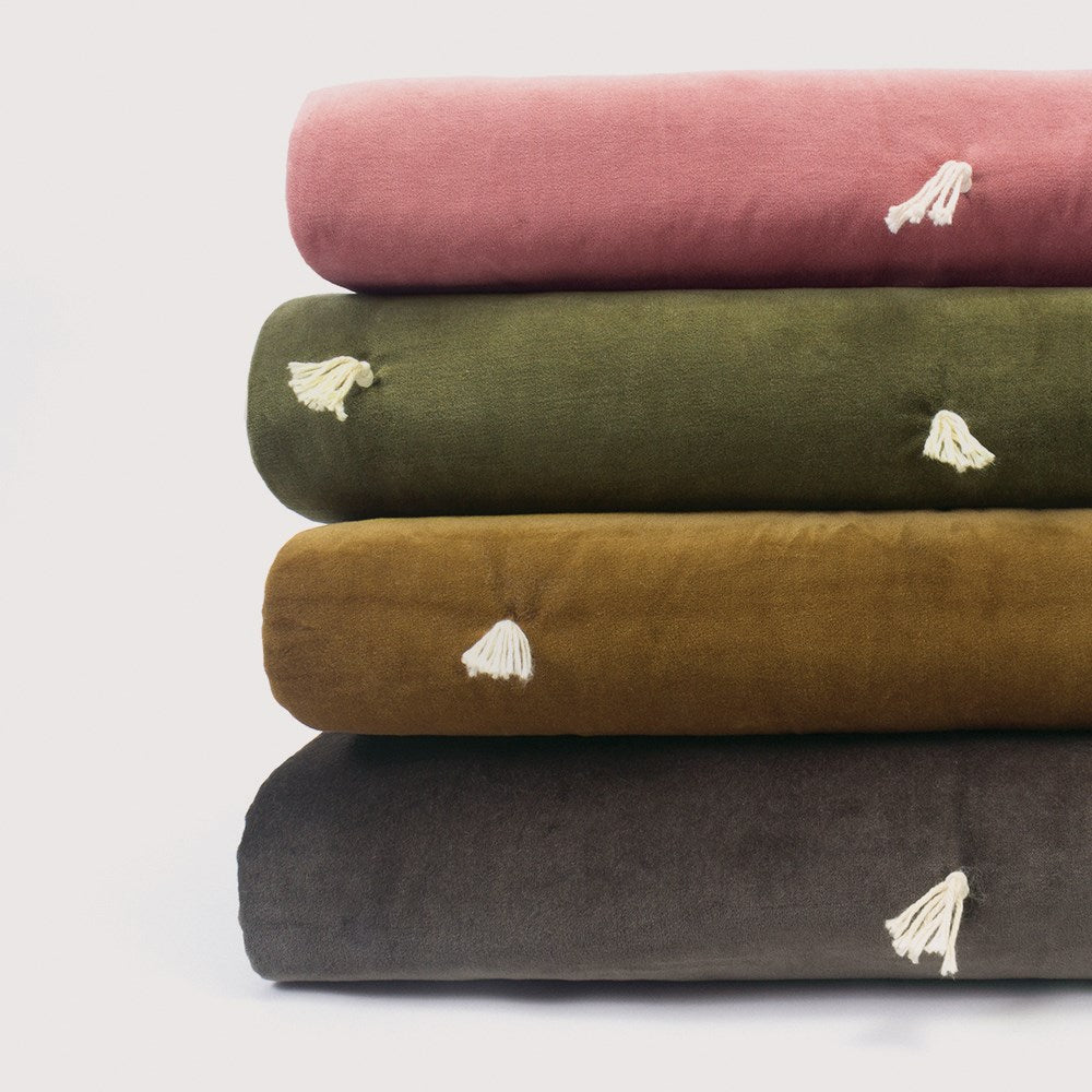 Snuggle into our Oakura. 100% cotton velvet front with natural cotton ties and reverse is natural in cotton/flax with a lofty filling. 260 x 240cm. Gentle cold machine wash, no bleach. Do not tumble dry or dry clean. Made in India. Please note Pillowshams sold separately.