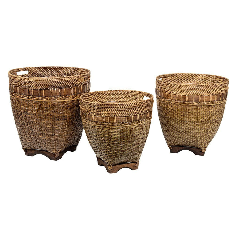 Set of 3 baskets are handmade from rattan, one of the strongest woods. Each basket is a work of art in itself featuring 3 different weaves. Plastic lined. L: 45 x 45cm, M: 42 x 38cm, S: 35 x 33cm